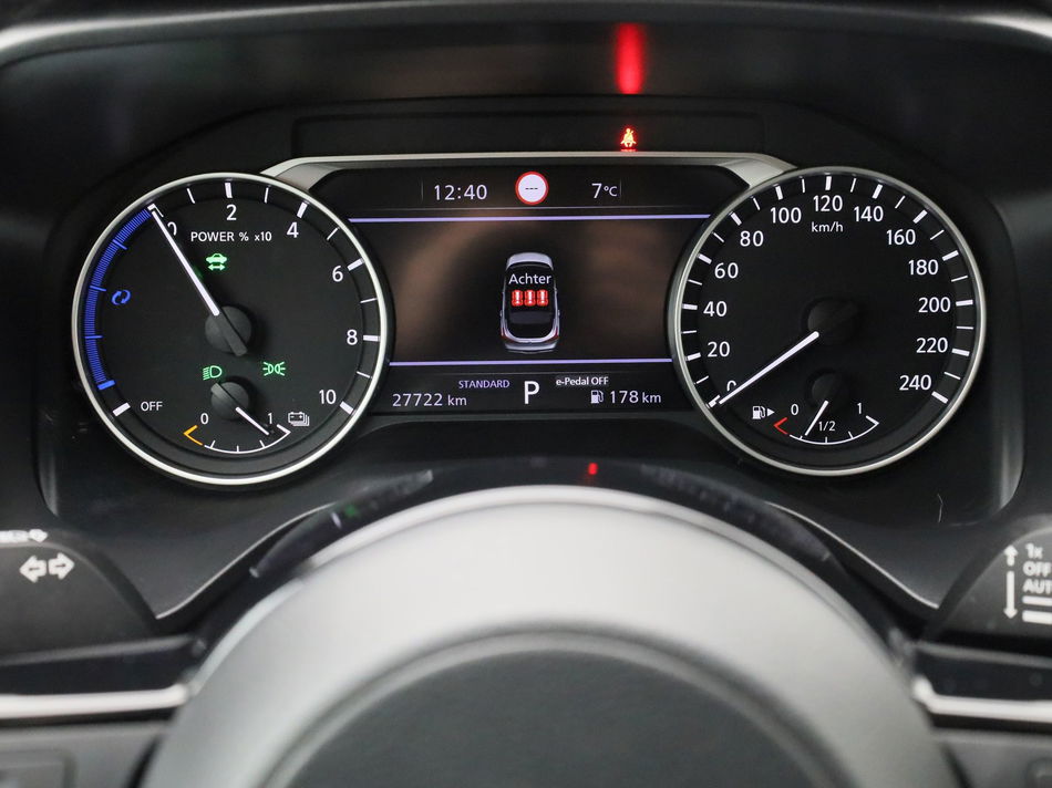 Verken de digitale wereld van mobiliteit waar het digitale dashboard alles biedt wat u nodig heeft om uw reis comfortabel te maken. Kinderfietsje niet gezien bij het inparkeren? Dat gebeurt u nooit meer. Daar zorgt de achteruitrijcamera wel voor! Adaptive cruise control houdt de ingestelde snelheid vast en houdt afstand tot het voertuig voor u. Kop aan kont langzaam rijden: dan is afstand houden soms lastig. De file assistent helpt en zorgt automatisch voor veilige ruimte tot de voorligger. Ook als die tot stilstand komt. Het full map navigatiesysteem loodst u snel naar uw reisdoel. Ook is de Nissan uitgerust met: achteropkomend verkeer waarschuwing, kruisend verkeer detectie, automatische airconditioning, schakelpaddles aan het stuur, draadloos opladen en regensensor.